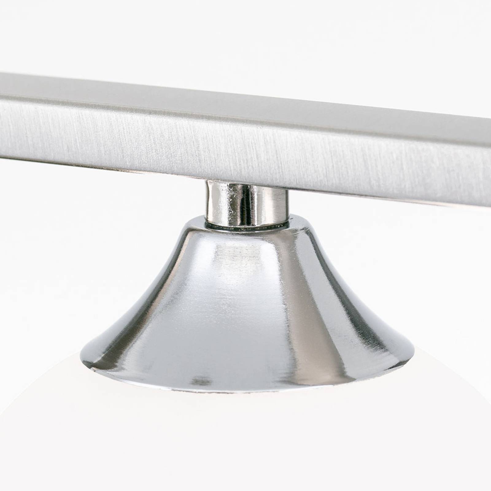 Lampada a sospensione Snowwhite con cinque sfere di vetro bianco opale sull'astaQuesta lampada a sospensione è certamente chiamata Snowwhite per i suoi cinque paralumi sferici in vetro bianco opale, distribuiti uniformemente sulla lunga asta della lampada. L'asta è appesa a due cavi di sospensione a destra e a sinistra e viene così mantenuta in posizione. I cinque paralumi sferici sono dotati di prese G9 che possono essere equipaggiate con lampade alogene fino a 20 W. Il vetro bianco opalino crea un effetto luminoso. Il vetro bianco opalino produce una luce molto uniforme e soprattutto non abbagliante, perfetta per il lungo tavolo della sala da pranzo o per il bancone della cucina. Con la scelta di sorgenti luminose dimmerabili e di un dimmer esistente, è possibile regolare anche la luminosità dell'apparecchio.
