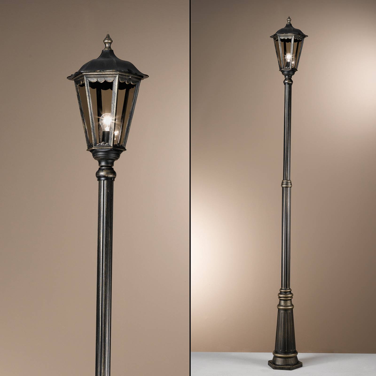 Lampione Puchberg per l'ambiente esterno Anche l'ambiente esterno dovrebbe essere illuminato di notte in modo sicuro. Questo è garantito dal lampione Puchberg, che oltre all'aspetto della sicurezza durante la notte, di giorno offre un design attraente e diventa un catturasguardi. La montatura della lampada e i vetri del diffusore sono coordinati cromaticamente. I vetri in delicato grigio fumo si abbinano perfettamente alla montatura nera dorata.