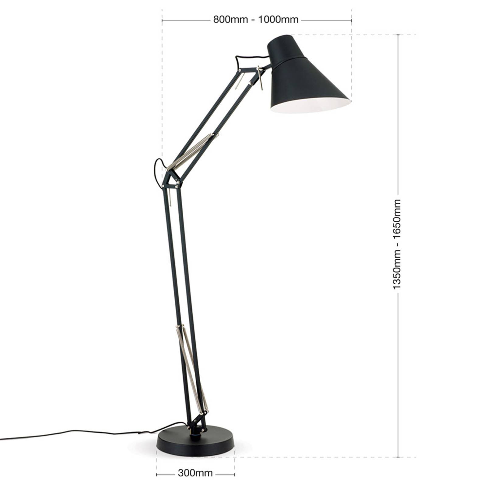 Lampada da terra regolabile doppia Bachelor in acciaio Il design abitativo moderno del tipo più diverso può essere aggiornato con la lampada da terra Bachelor. Bachelor è realizzato interamente in acciaio e laccato in nero. Solo l'interno del paralume è laccato di bianco, in modo che la luce possa essere riflessa in modo ottimale. L'altezza, la proiezione e la direzione della luce della lampada da terra possono essere adattate in modo ottimale alle esigenze personali e alle condizioni spaziali per mezzo di due giunti integrati nel telaio. Ideale come fonte di luce accanto alla poltrona o al divano. - Cavo rivestito di tessuto in nero - Dotato di interruttore a bilanciere