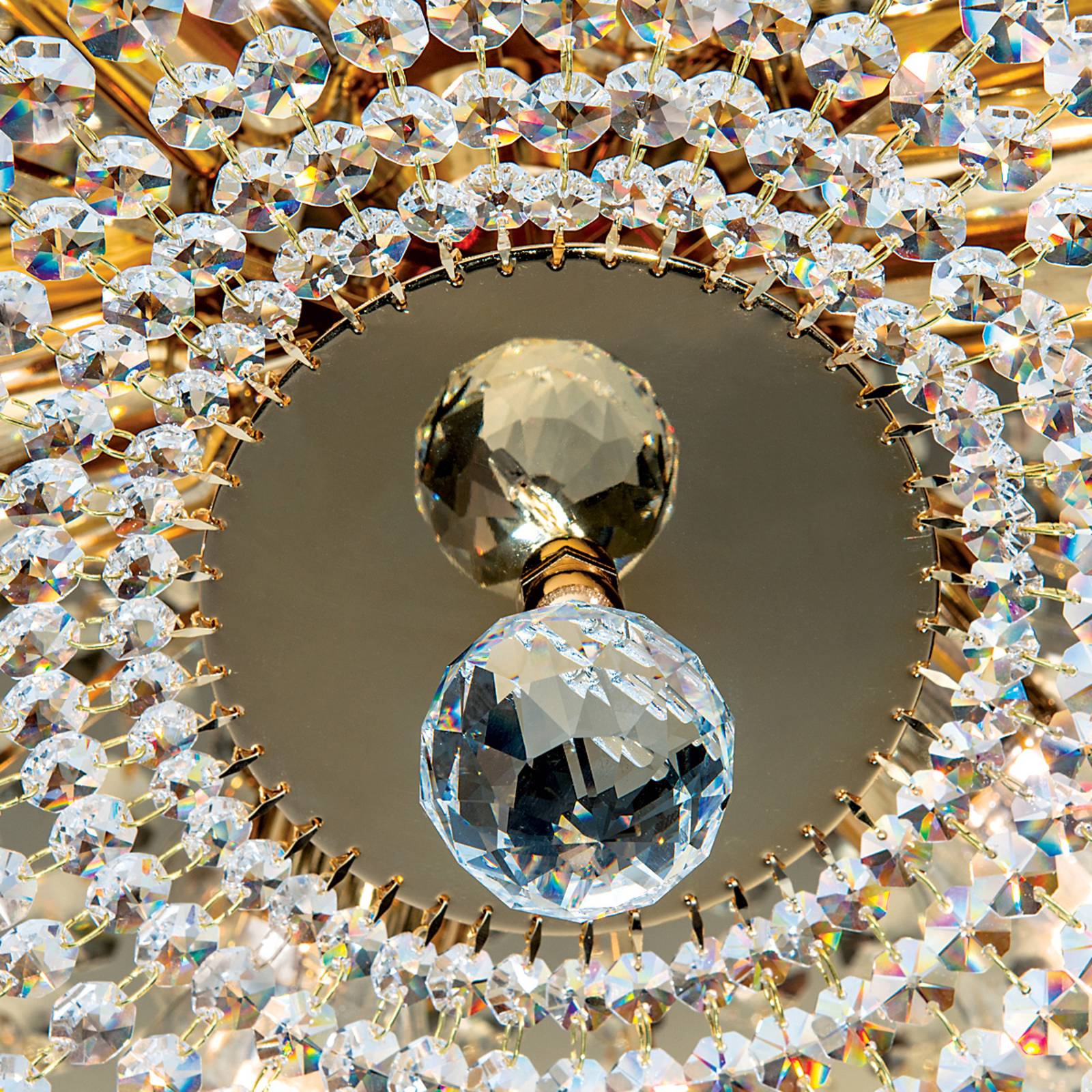 Plafoniera SHERATA lussuosa con cristalli Schöler, doratura 24 carati Al cospetto di questo lampadario tutto intorno inizia a brillare e scintillare. Una miriade di cristalli splendidamente uniti in un quadro di insieme che garantisce momenti magici che si leggono solo nelle favole. Alla luce di questa plafoniera ornata da una cascata di cristalli nella forma classica a cestino si possono immaginare gli ambienti più svariati. Le lampadine sono nascoste dietro i cristalli e si spianano la strada attraverso le pietre di vetro molato, garantendo effetti di luce magici! In queste lampade qualità, eleganza, pregiata lavorazione e durata sono al centro dell'attenzione. Qui la creatività dei designer e l'arte artigianale austriaca si fondono in un prodotto molto apprezzato in tutto il mondo. Dal 1948 le lampade di questo produttore vengono prodotte al 100% in Austria, il che garantisce anche una disponibilità di ricambi pluriennale.