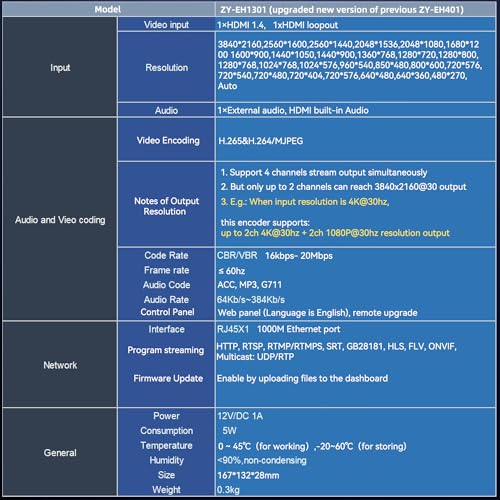 【Risoluzione ingresso/uscita】 Ingresso: 1 canale HDMI supporto di ingresso H.264/AVC profilo alto/profilo principale/formato di codifica profilo di base. Risoluzione massima HDMI 3840×2160@30fps, 1080p@60fps. Uscita: supporto 2 uscita di streaming video. Entrambe la risoluzione di uscita possono essere 4K@30fps. Supporto 1 canale video loop-out.