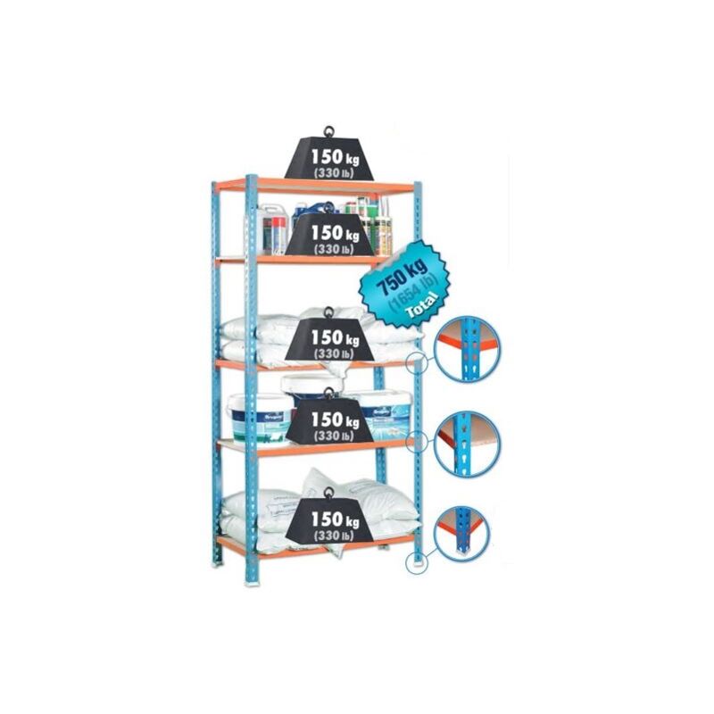 Scaffale metallico con 5 ripiani in truciolato. Misura: 200x100x50 cm ( altezza x larghezza x profondità). Montaggio senza viti. 150 Kg per ripiano con carico uniformemente distribuito.(750 kg totali) Tempo di montaggio stimato 9 minuti Non è necessario ancorare al muro. Resistente, non vacilla. Colore blu/arancione.