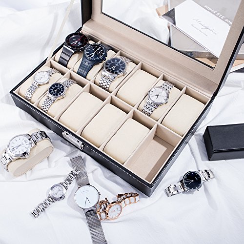 MS - Espositore/scatola/cofanetto per orologi con serratura, colore: nero, nero, 12 emplacements