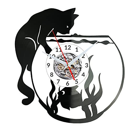 Orologio da parete a forma di gatto e pesce, in vinile, con disco in stile retrò, per la casa, ottimo regalo, orologio gatto e pesce