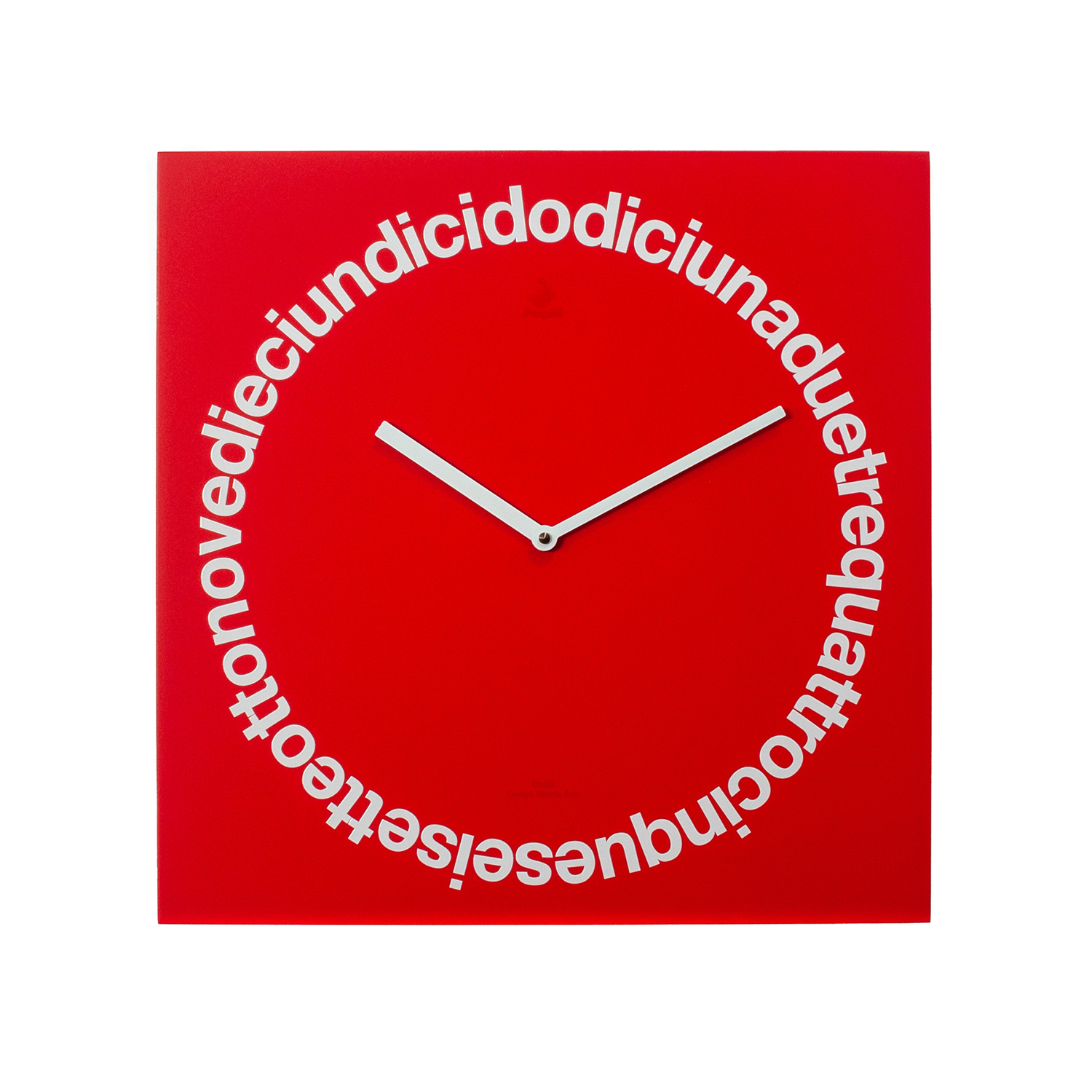 Dodici, progettato dal designer Alberto Sala per il brand italiano Progetti, è un orologio da parete dove i numeri si trasformano in lettere, dando vita ad un elemento decorativo diverso e fortemente espressivo. Le scritte sono lucide e leggermente in rilievo, generate con una particolare tecnica per un piacevole contrasto con la struttura in legno rifinita in rosso. Movimento a batteria al quarzo di produzione tedesca. Necessita di batteria AA non inclusa. Dimensioni: 40x40x4 cm.