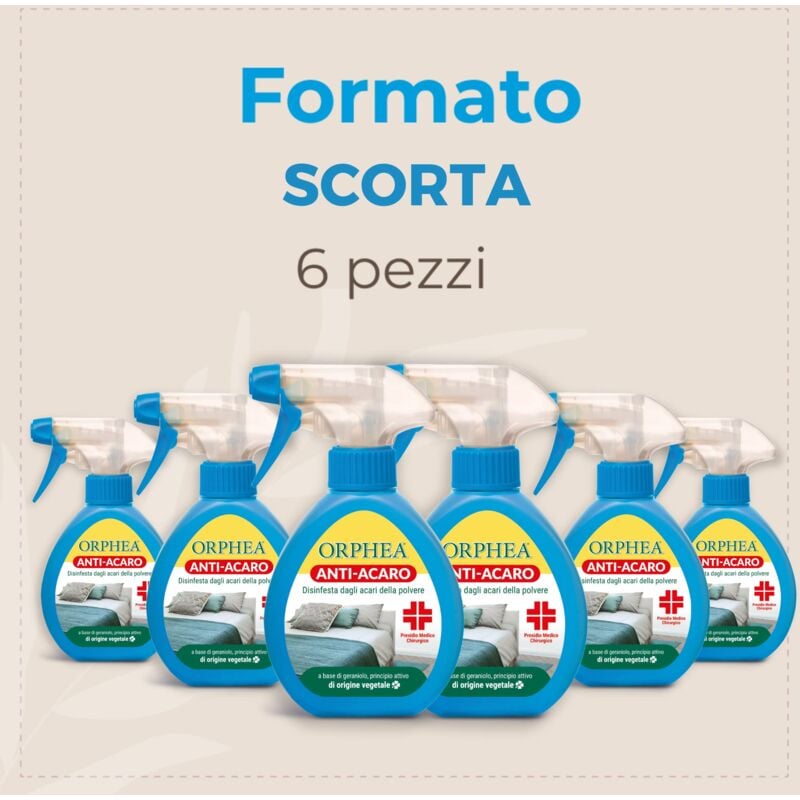 Descrizione Descrizione Orphea anti-acaro elimina efficacemente gli acari della polvere, origine di importanti allergie alle vie respiratorie. La formulazione è a base di geraniolo, principio attivo di origine vegetale estratto dai fiori di geranio. Il prodotto può essere impiegato nelle camere da letto, negli armadi, su materassi, cuscini, divani, coperte, tappeti, tendaggi e direttamente sugli abiti. è un prodotto utile per disinfestare dagli acari anche l'auto. Per un'azione preventiva dalle allergie si raccomanda la rimozione degli acari mediante l'utilizzo dell'aspirapolvere dopo almeno 1 ora dal trattamento. Non macchia e lascia sui tessuti una delicata profumazione di pulito. Erogare il prodotto sui tessuti da trattare da una distanza di 30 cm circa, con 15/20 spruzzate per mq di superficie. Verificare la resistenza del tessuto da trattare in un angolo nascosto dello stesso. Ripetere il trattamento a distanza di una settimana. Ingredienti Geraniolo