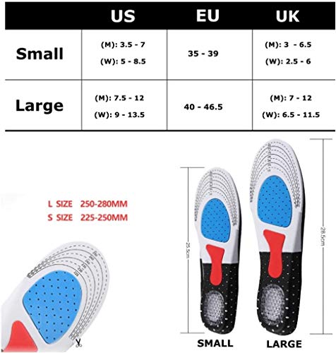 TAGLIA TAGLIA SOTTOPIEDE: questa soletta sportiva ha due taglie tra cui scegliere, taglia S (4,5-8,5), adatta per donna , taglia L (7-12), adatta per uomo, la parte posteriore della soletta è progettata con una linea di taglie, Puoi tagliarlo, adattarlo al 100% alla taglia delle tue scarpe.