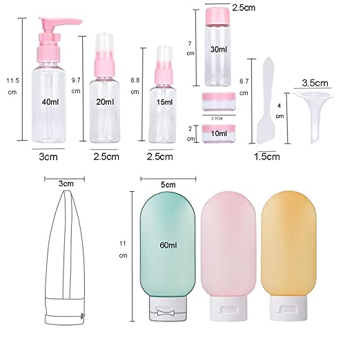Il nostro set comprende 3 contenitori per shampoo, 1 flacone spray, 2 bottiglia di lozione, 1 flacone sospinta, 2 contenitori per crema, 1 cucchiaio e 1 imbuto. Il set versatile adatto a tutte le tue esigenze di viaggio.