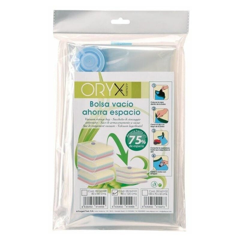Borsa vuota salvaspazio - Misura: 80x120 cm. - Risparmia fino al 75% di spazio. - Istruzioni per l'uso: > Metti i vestiti all'interno della borsa. > Chiudi il sacchetto utilizzando il sistema a clip. > Collega l'aspirapolvere fino a quando tutta l'aria fuoriesce. > Chiudi il sacchetto con il tappo. - Ideale per riporre e organizzare i vestiti, cuscini, biancheria da letto, trapunte, coperte, piumini, cuscini, ecc. facilitando lo stoccaggio a casa, il cambio del guardaroba, i viaggi e gli spostamenti. - Protegge da acqua, polvere, sporco e odori risparmiando spazio.