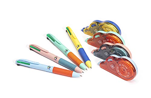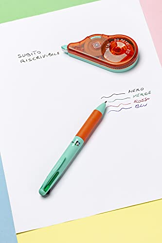 SET CANCELLERIA: Kit composto da 1 correttore a nastro della lunghezza di 20 metri e 1 penna a sfera 4 colori a scatto che permette di disporre di inchiostro blu, rosso, verde e nero in un unico prodotto, scegliendo il colore con un semplice click. La punta a sfera da 1.0 mm assicura un tratto ultra-fluido e super scorrevole, mentre il correttore a nastro offre una copertura subito riscrivibile. Kit ideale per rifornire la cancelleria di scuola, ufficio e università