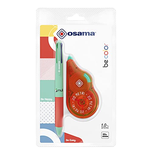 OSAMA - Set Cancelleria con Bianchetto a Nastro, 20 METRI + Penna a Sfera 4 Colori 4 Multi, Kit Cartoleria e Cancelleria Scuola e Ufficio con Correttore a Nastro e Penna Multicolore, Verde/Arancio