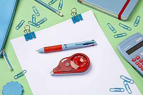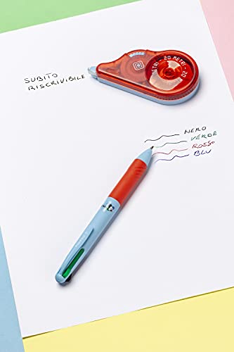 SET CANCELLERIA: Kit composto da 1 correttore a nastro della lunghezza di 20 metri e 1 penna a sfera 4 colori a scatto che permette di disporre di inchiostro blu, rosso, verde e nero in un unico prodotto, scegliendo il colore con un semplice click. La punta a sfera da 1.0 mm assicura un tratto ultra-fluido e super scorrevole, mentre il correttore a nastro offre una copertura subito riscrivibile. Kit ideale per rifornire la cancelleria di scuola, ufficio e università