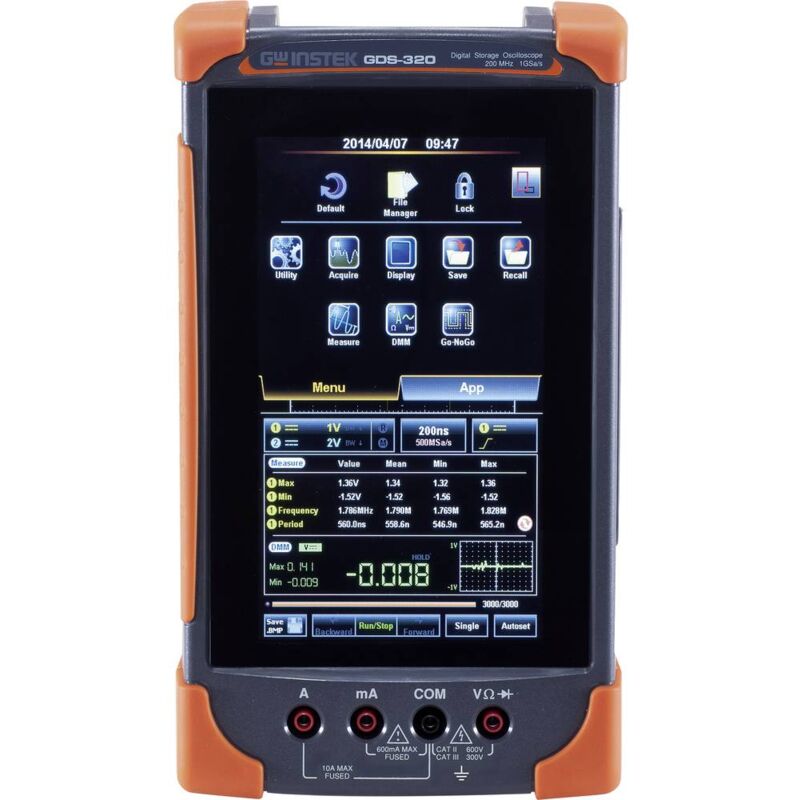 Dettagli tecnici Altezza 136 mm Ampiezza di banda 100 MHz Calibrato di fabbrica senza certificato Canali (LOV - solo per titolo) 2 canali Caratteristiche oscilloscopio Portatile, Memoria digitale (DSO), Funzioni multimetro Dimensioni (L x L x A) 60 x 240 x 136 mm Interfacce (componenti) USB Larghezza 240 mm Lunghezza 60 mm Numero max. Ingressi analogici 3 Peso 1.5 kg Tensione di alimentazione (dettagli) 115 V/AC,230 V/AC,pacco batteria Tipo prodotto Oscilloscopio portatile Multimetro: categorie di misurazione CAT III 300 V, CAT II 600 V Impedenza: 10 MΩ Intervallo di misura della tensione continua: 0,001 mV - 1000 V Intervallo di misura della tensione alternata: 0,001 mV - 700 V Intervallo di misura della corrente continua/alternata: 10 mA - 10 A Resistenza campo di misurazione: 50 Ω - 5 MΩ Prova diodi Prova di continuità con cicalino acustico Misurazione della temperatura: da -50 a +1000 °C Tipi di sensore: B, E, J, K, N, R, S, T. Oscilloscopio digitale portatile con memoria GDS-310