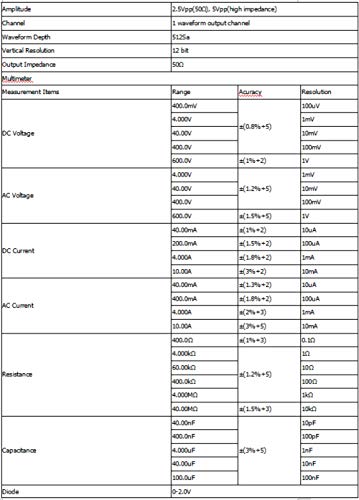 Oscilloscopio Digitale--Oscilloscopio + sorgente di segnale + multimetro: uno strumento per molteplici scopi, con le funzioni di tre dispositivi di test universali. Funzione multimetro universale: può misurare tensione, corrente, resistenza, diodo, condensatore e test di continuità. Funzione generatore di segnale: fornisce onda sinusoidale, onda quadra, onda triangolare, onda trapezoidale e altre forme d'onda, la frequenza dell'onda sinusoidale può raggiungere i 25 MHz.