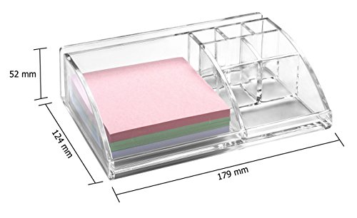 Chunky, clear acrylic desk tidy complete with 300 memo sheets. Incoporates six compartments for paperclips, coins, drawing pins, highlighters etc along with a letter holder slot at the back.
