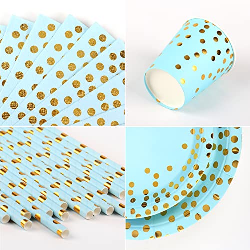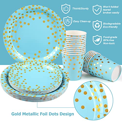 16 Ospiti Set Piatti Biodegradabili Blu Oro Piatti Carta Tovaglioli Bicchieri Cannucce Carta Tovaglia per Festa Compleanno Ragazzo Baby Shower Boy Anniversari Doccia Nuziale Piatti di Carta Blu