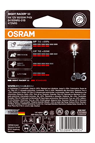 OSRAM NIGHT RACER 50 - Per una guida sicura in moto - 50% di luce in più e un fascio luminoso più lungo di 20 metri rendono questo lampada lo strumento perfetto per prevenire i pericoli della strada.