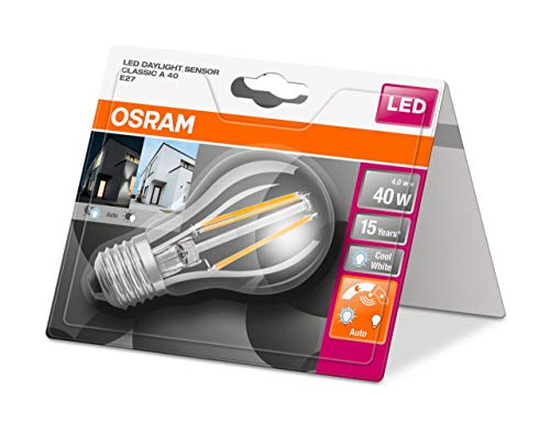 OSRAM Daylight Sensor Classic A Lampadina LED, Attacco E27, Bianca Fredda, 2700 K, 4 W = Equivalenti a 40 W, LED DAYLIGHT SENSOR CLASSIC A, Chiaro, Taglia Unica
