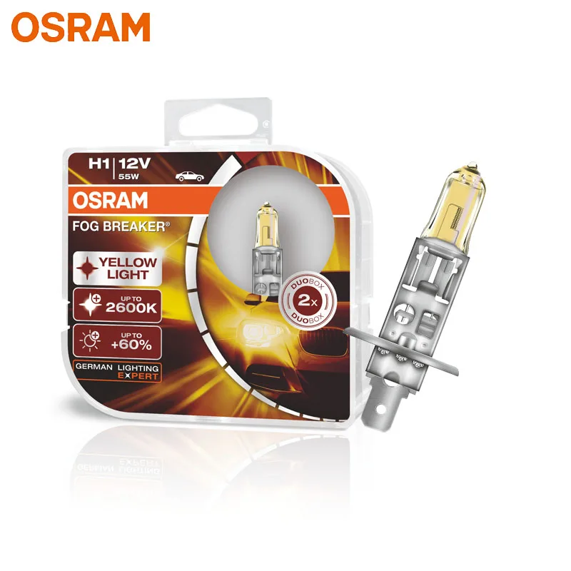 OSRAM H1 Yellow 62150FBR Halogen Fog Breaker 12V 55W Car Original Headlight 2600K Light +60% Brighter Auto Genuine Lamps, Pair