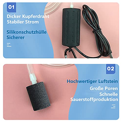 【Basso consumo energetico】 Il consumo energetico di questa pompa ad aria per ossigeno è solo 1 W, il flusso massimo è 210 L/H, la durata è lunga e l'effetto di risparmio energetico è buono. Se è collegato a un alimentatore da 10000 MAH, può durare fino a circa 50 ore.