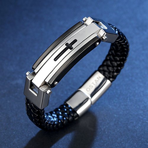 Ostan Uomo Gioielli Corda il Braccialetto di Pelle Intrecciato Croce Religiosa Bracciale in Acciaio Inossidabile Nero