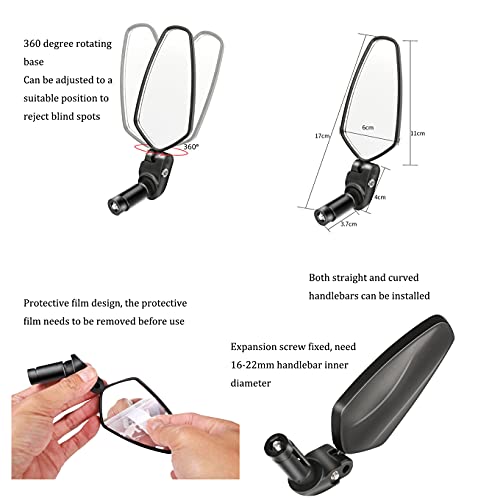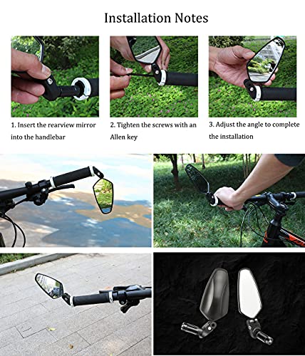 Montaggio comodo e veloce: fissaggio con viti a espansione, adatto per il diametro interno del manubrio di 16-22 mm/0,62"-0,86", fissaggio con una chiave a brugola, impugnatura dritta e maniglia curva possono essere montati. Requisiti di installazione: per installare lo specchio, il manubrio della bicicletta deve avere un foro e il diametro interno del manubrio è nell'intervallo di 16-22 mm/0,62"-0,86" prima di poter essere installato.