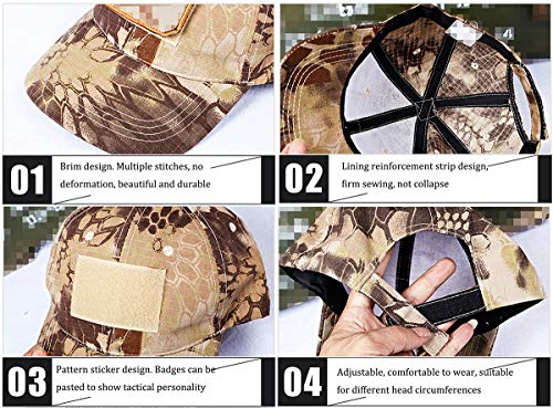 Caratteristiche del cappello: il tessuto del berretto da baseball mimetico è realizzato in cotone elasticizzato, che è comodo e delicato sulla pelle e ha un forte assorbimento dell'umidità. Il rivestimento anteriore è realizzato in tessuto mimetico indeformabile, cappello rinforzato mimetico tattico, tessuto a quadri, resistente all'usura e traspirante. Design rinforzato, nessuna deformazione.