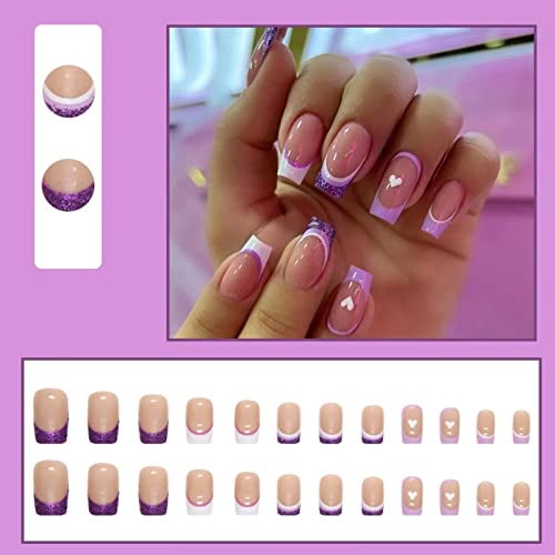 OUBFUUY Cuore viola unghie finte, quadrato stampa su unghie francese Tips donna unghie finte medio lucido usura quotidiana unghie Artificail per la decorazione manicure Nail Art