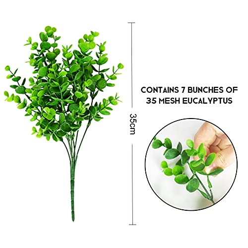 【Quantità e dimensioni】La confezione di foglie di eucalipto artificiale che forniamo contiene 7 mazzi di eucalipto a 35 maglie, ogni mazzo è lungo circa 35 cm.