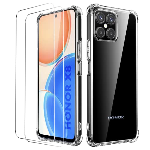 Oududianzi- Cover per Honor X8 Custodia, con 2 Pack Pellicola Protettiva Vetro Temperato, Custodia Morbido Silicone Trasparente Case con Cuscino D'aria Antiurto Paraurti