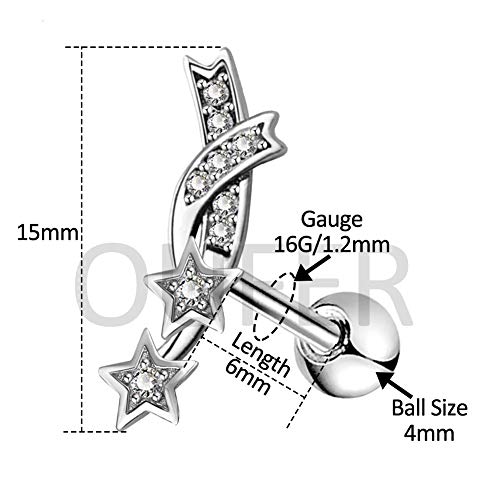 OUFER 16G 316L acciaio chirurgico curvo chiaro CZ trago Stud stella elica orecchini cartilagine piercing orecchino e Acciaio inossidabile, colore: 2 pezzi argento., cod. OHE006-S2