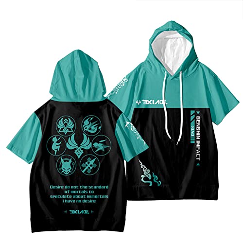 OUHZNUX T-Shirt Genshin Impact con Cappuccio, Wind Attribute Xiao Game Pullover A Maniche Corte con Stampa 3D, Felpa Casual Moda Unisex (2XS-4XL)