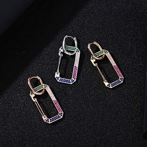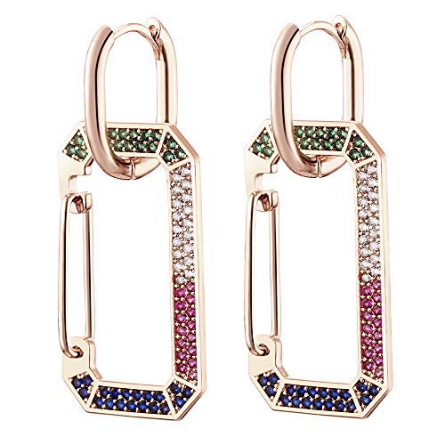 Ouran Orecchino a cerchio rettangolare Huggie da donna, orecchini pendenti ipoallergenici placcati in oro rosa e argento con cristalli di zirconi (Cristallo di colore, Oro rosa)