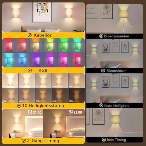 OurLeeme Lampada da parete a LED per interni, 2 pezzi, senza fili, RGB da parete, in tessuto, dimmerabile, luminosità regolabile, 2 livelli di temporizzazione lampada da comodino con lampadina