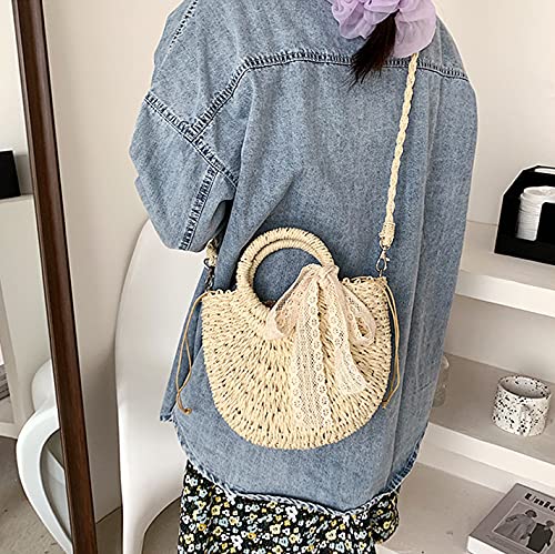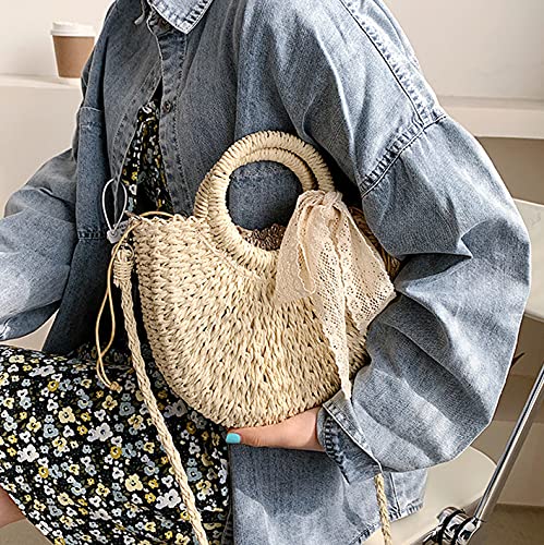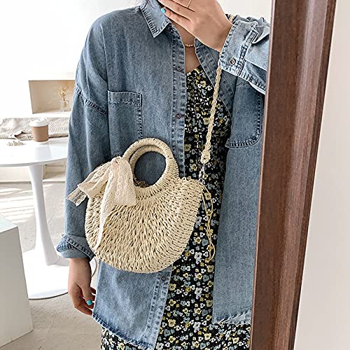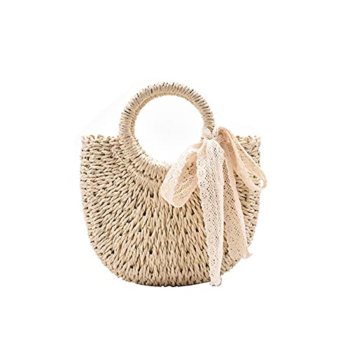 Ousyaah Borsa da spiaggia estiva, borsa da donna, in paglia, con tessuto rotondo, in rattan, borsa da spiaggia, beige, 24 * 19 * 7cm