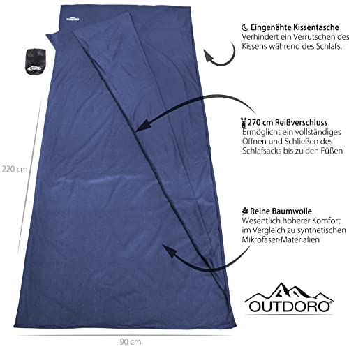 Outdoro, sacco a pelo da viaggio ultra leggero, solo 350 g di puro cotone, con scomparto per cuscino, sottile, piccolo e compatto, adatto per i viaggi, perfetto per essere inserito all'interno del normale sacco a pelo, per adulti, bambini, per l'estate