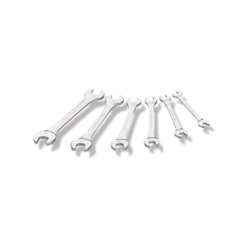 Dettagli: Set di 6 chiavi aperte forgiate in acciaio al cromo vanadio. 2 aperture per ogni chiaveFinitura lucida e brillanteAngolo di ritorno 30°Elevata coppia di serraggioForma ammorbidita per il comfort della mano. Composition: 10-8X9N10-10X11N10-12X13N10-14X15N10-16X17N10-18X19N Caratteristiche: Contenitore: Scatola Numero di pezzi: 6