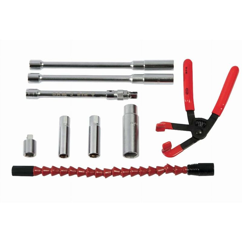 Dettagli: Composto da: prese per candele 3/8 - corte 14-16-21 (90 mm) - lunghe 14-16 (250 mm). Prolunga angolata 3/8 da 125 mm. Riduttore 1/2 > 3/8. Tubo per installazione candele. Morsetto per travi. Peso: 1,480 Kg Caratteristiche: Contenitore: Modulo in schiuma Numero di pezzi: 9
