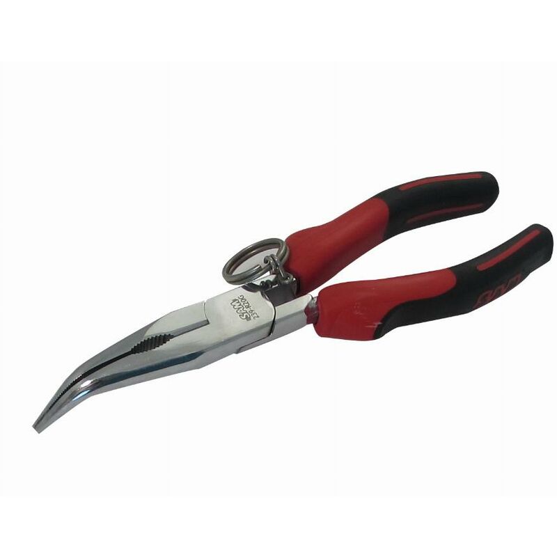 Dettagli: Aste in due materiali. Molla di ritorno integrata per un funzionamento regolare. Forgiato in acciaio al cromo vanadio. Beccuccio scanalato per una migliore presa. Beccuccio angolato a 45°. Funzione di taglio integrata per filo di acciaio duro. C: Capacità di taglio per filo di acciaio duro. Caratteristiche: E (mm): 2,5 e1 (mm): 1,5 e2 (mm): 8 L1 (mm): 73 L (mm): 200 L: 8 C (mm): 1,8 Peso (g): 160
