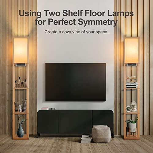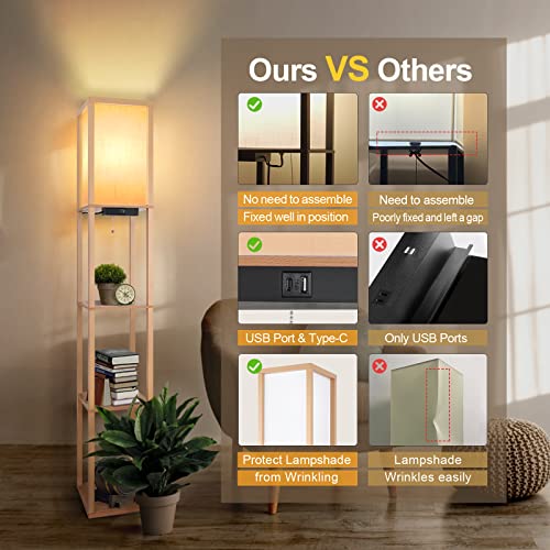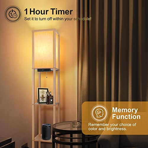 OUTON Lampada da Terra Legno con Scaffale, da Salotto Dimmerabile con Telecomando, Lampada a Stelo 160cm, 2 Porte di Ricarica USB, Piantana da Terra per Soggiorno, Camera Da Letto, Legno