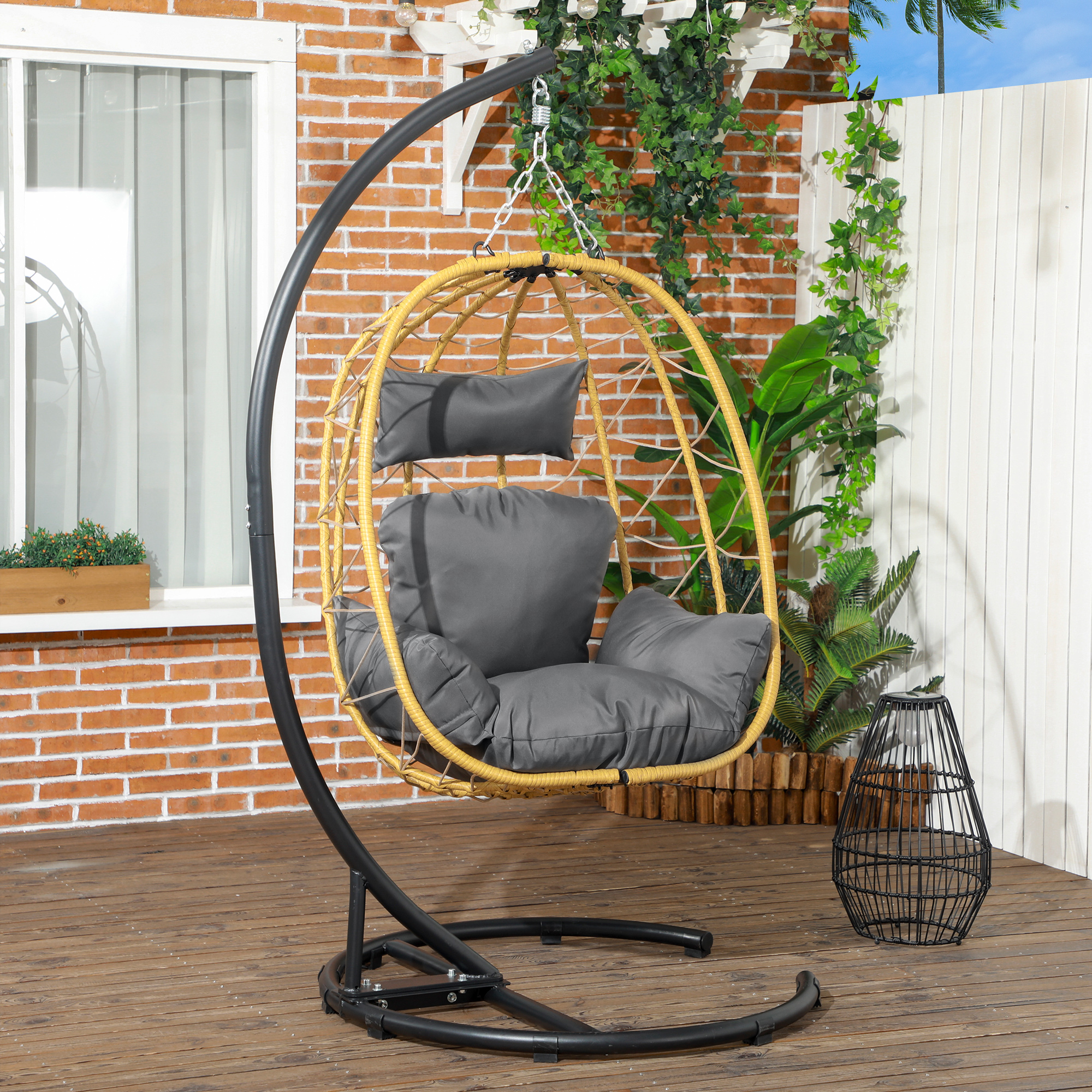 Porta un relax di livello nei tuoi spazi esterni grazie a questa poltrona sospesa Outsunny e soddisfa le tue esigenze di comodità in giardino. Realizzata con struttura in acciaio antiruggine e rivestita in rattan PE intrecciato a mano, la struttura si rivela abbastanza stabile da resistere alle intemperie durante la bella stagione, creando così un luogo elegante e di supporto affidabile per riposare.