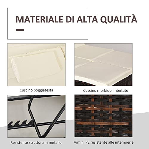 Outsunny Sdraio da Giardino Doppia con Tettuccio e Schienale 5 Reclinazioni, Lettino Prendisole in Rattan PE 196x137x31cm Bianco Crema