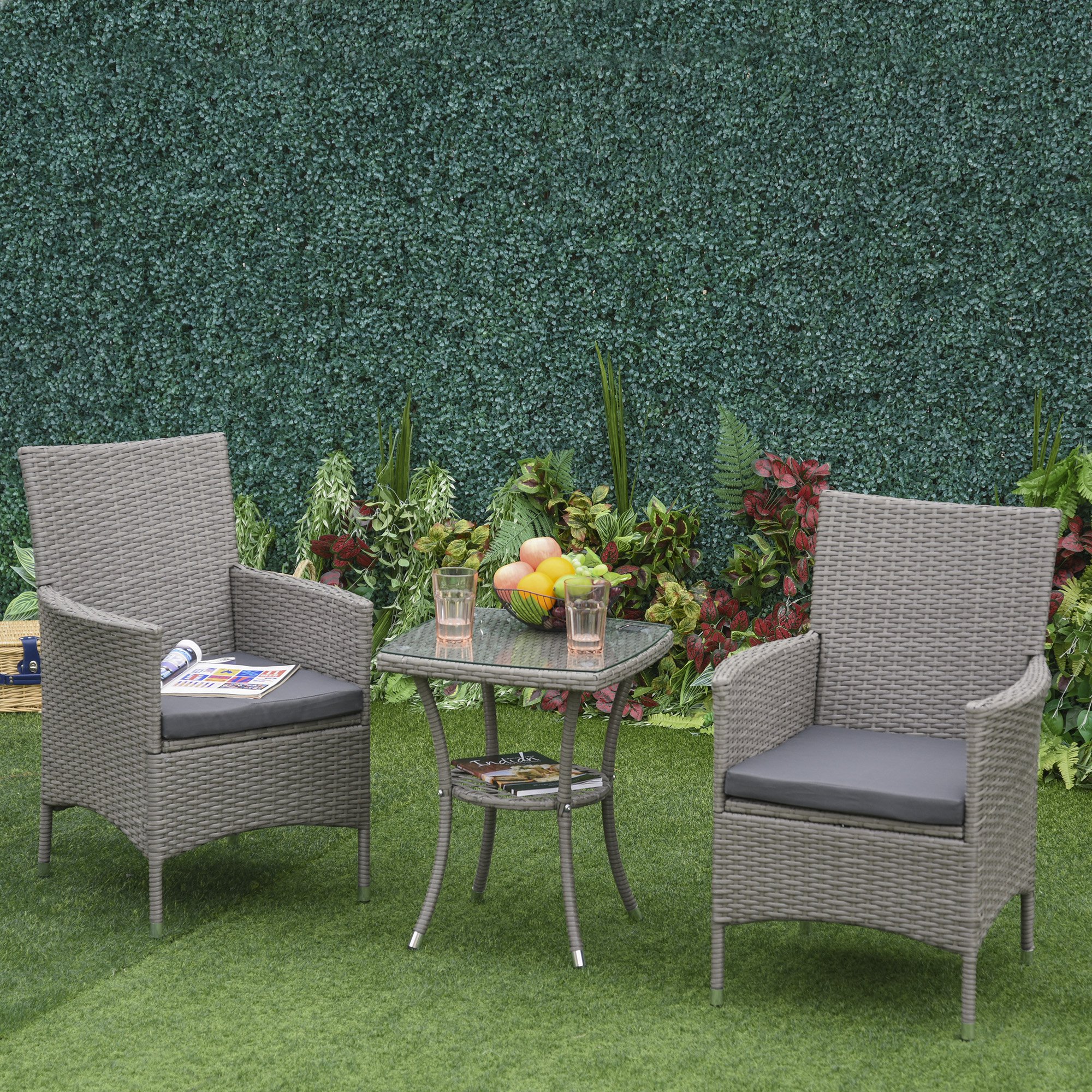 Crea un angolo di relax nel tuo giardino con questo salottino Outsunny! Il set include un tavolino e due sedie da giardino in rattan sintetico, un materiale elegante e molto resistente: perfetto per gli ambienti esterni. Il telaio dei mobili è realizzato in acciaio e il piano del tavolo è in vetro temperato, per un tocco di eleganza in più.