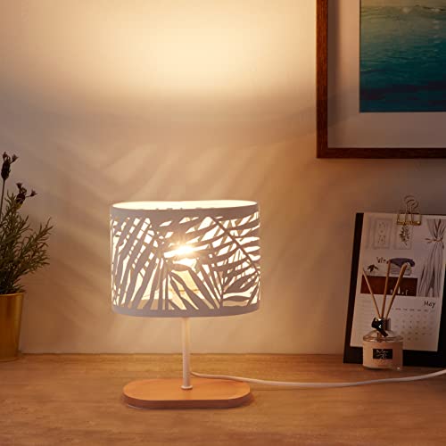 OuXean Piccola lampada da comodino, lampada da scrivania E14 con base in legno e paralume in metallo per camera da letto, camera dei bambini, bar, bianco (senza lampadine)