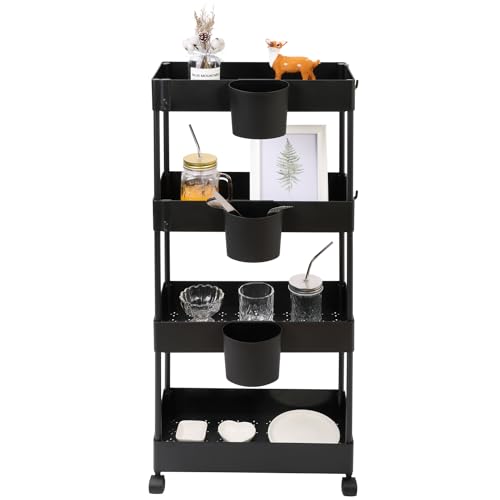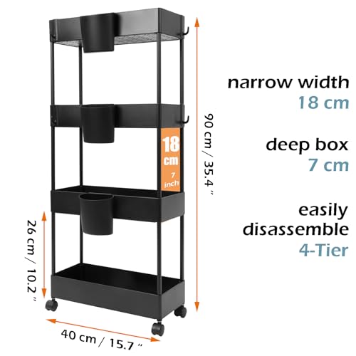OVAKIA Carrello con Ruote a 4 Scomparti, Sottile Carrellino Salvaspazio Carrelli Portaoggetti 18 cm per Cucina o Soggiorno, Spazi Stretti (Nero)