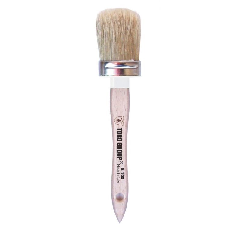 In pura setola bionda, manico in legno verniciato. Misura 16