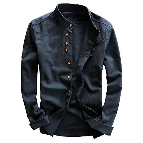 Oversize Camicia Henley in Lino Tinta Unita Stile retrò Cinese da Uomo Collo alla Coreana Maglietta T-Shirt Leggera Aderente Casual Estiva Taglie Forti Marina Militare M