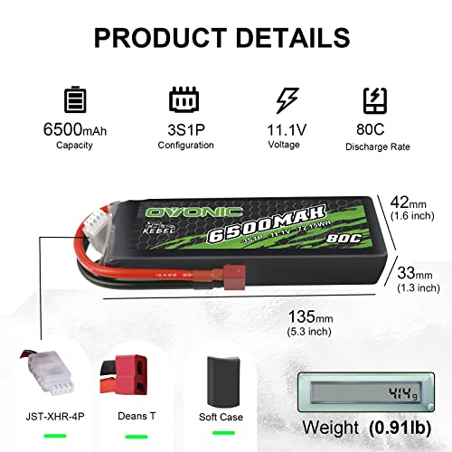 OVONIC Batteria Lipo RC 3S 11,1 V 6500 mAh 80C Deans T con spina rigida LiPo per aereo FPV RC auto, evader BX, quadricottero, camion, barca (1 pezzo)