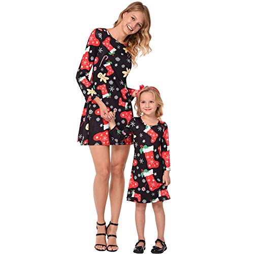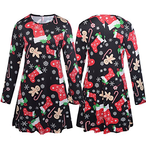 【Fashion Design】 Vestiti natalizio abbinato per ragazze e donne, girocollo classico, manica lunga, lungo sopra il ginocchio, linea A, abito svasato. L'elegante design a motivi natalizi, stampato con Babbo Natale, l'albero di Natale, i regali, il bastoncino di zucchero, il fiocco di neve o il pupazzo di neve, rende te e la tua ragazza più attraenti tra la folla .