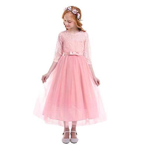OwlFay Vestito da Ragazza di Fiori Pizzo Tulle 3/4 Maniche Abito da Principessa Festa Nozze Abiti da Compleanno Prima Comunione Battesimo Danza Cerimonia Sera Vestito per Bambine Rosa 5-6
